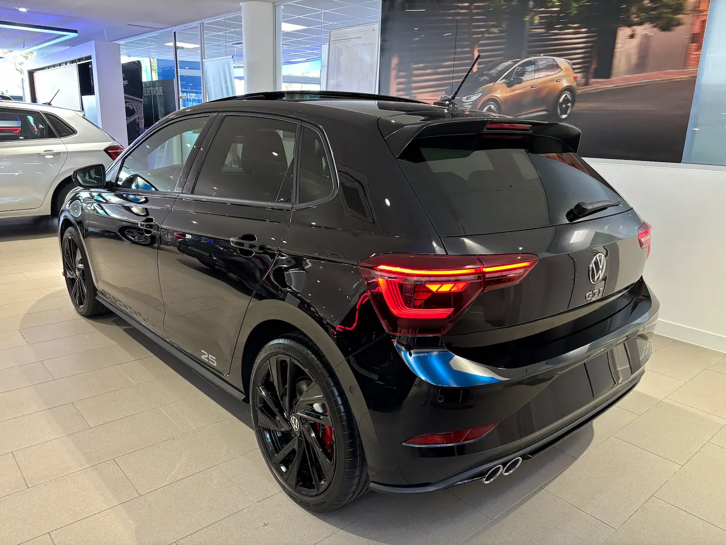 Esthétiquement, la Polo GTI Edition 25 se distingue par des détails spécifiques : des jantes Adelaide noires de 18 pouces, des badges spécifiques « GTI Edition 25 », ainsi qu’un toit noir contrastant avec les cinq coloris proposés. À l’intérieur, elle propose des sièges sport en cuir perforé, des inserts décoratifs en nid d’abeille, et un volant en cuir arborant le badge spécial 25 ans. Les seuils de porte affichent fièrement l’inscription « One of 2 500 », renforçant le sentiment d’un modèle vraiment unique.
