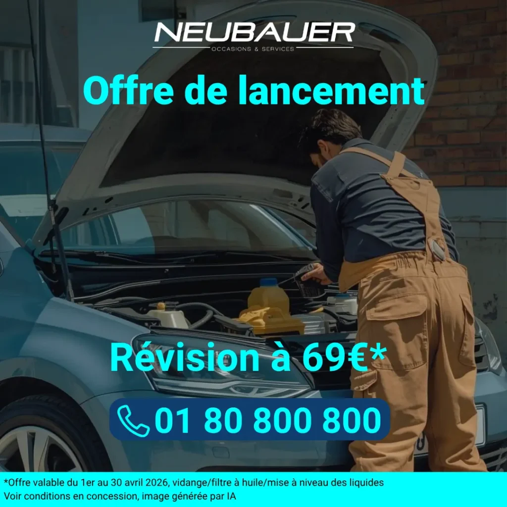 Pour célébrer notre arrivée et vous simplifier l’entretien au quotidien, nous lançons une offre de bienvenue : un forfait vidange à 69 €*. L’essentiel, au bon prix, pour repartir l’esprit tranquille avec un véhicule bien suivi, accompagné de l’expertise NEUBAUER dès votre première visite.